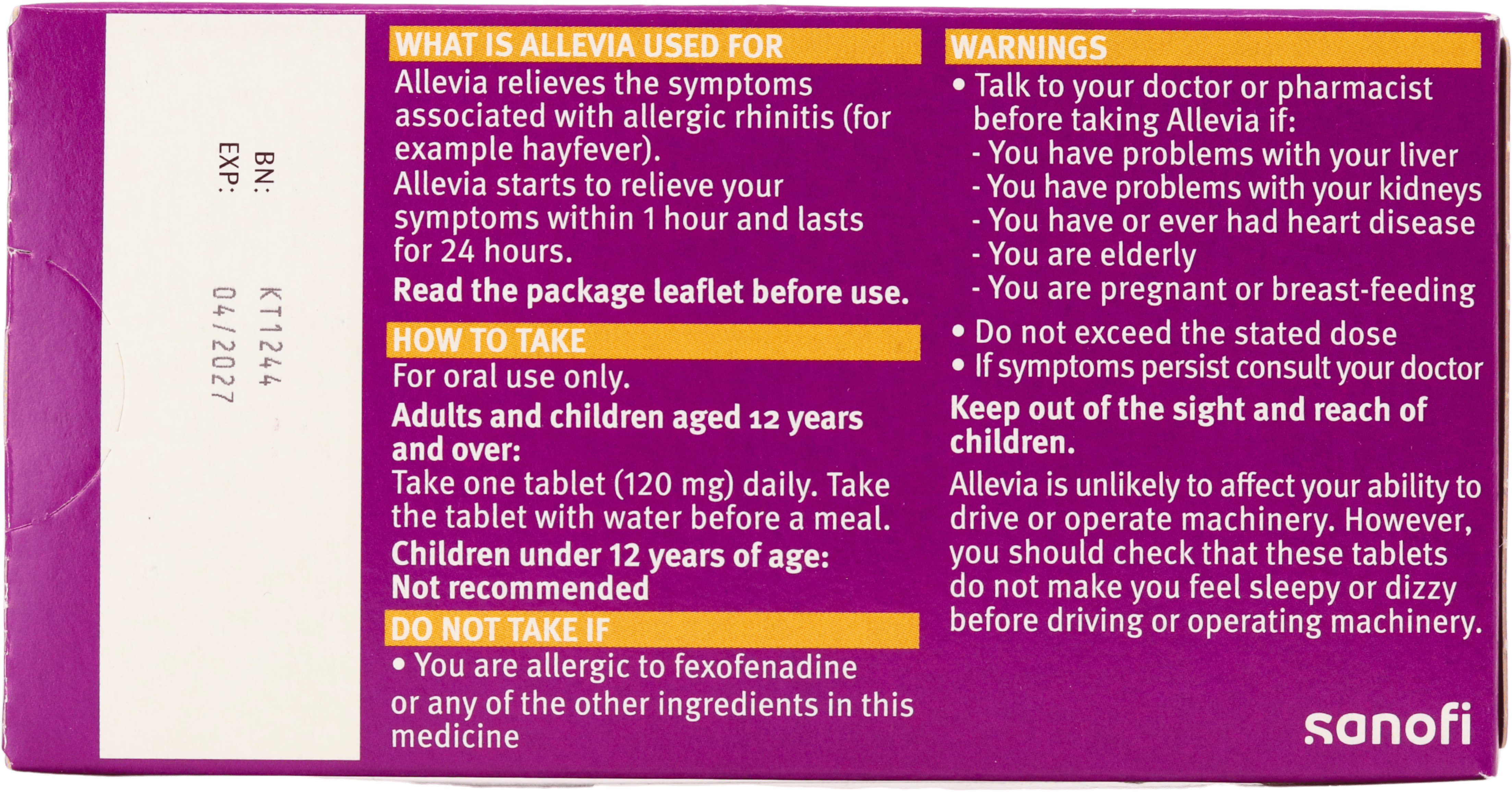 Allevia contains fexofenadine, an active ingredient that acts as a non-drowsy antihistamine. Fexofenadine blocks the release of histamine, which is responsible for causing allergic reactions, to relieve hay fever symptoms like sneezing, a runny or blocked nose, itchy eyes, and red and watery eyes.