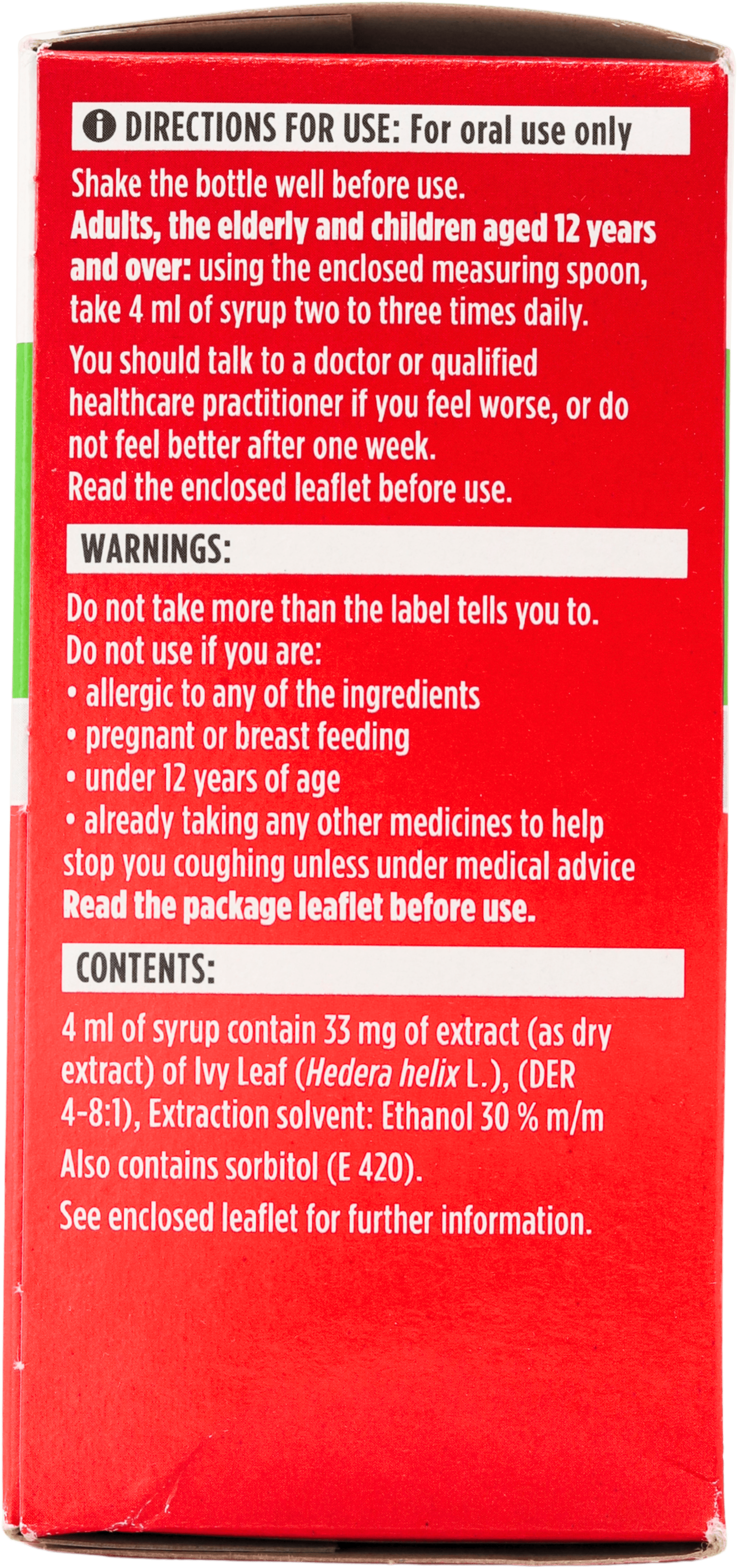 The syrup is infused with ivy leaf extract, a component known from olden times to address chesty coughs. Ivy leaf extract aids in dissolving and eliminating surplus mucus from the lungs and chest.