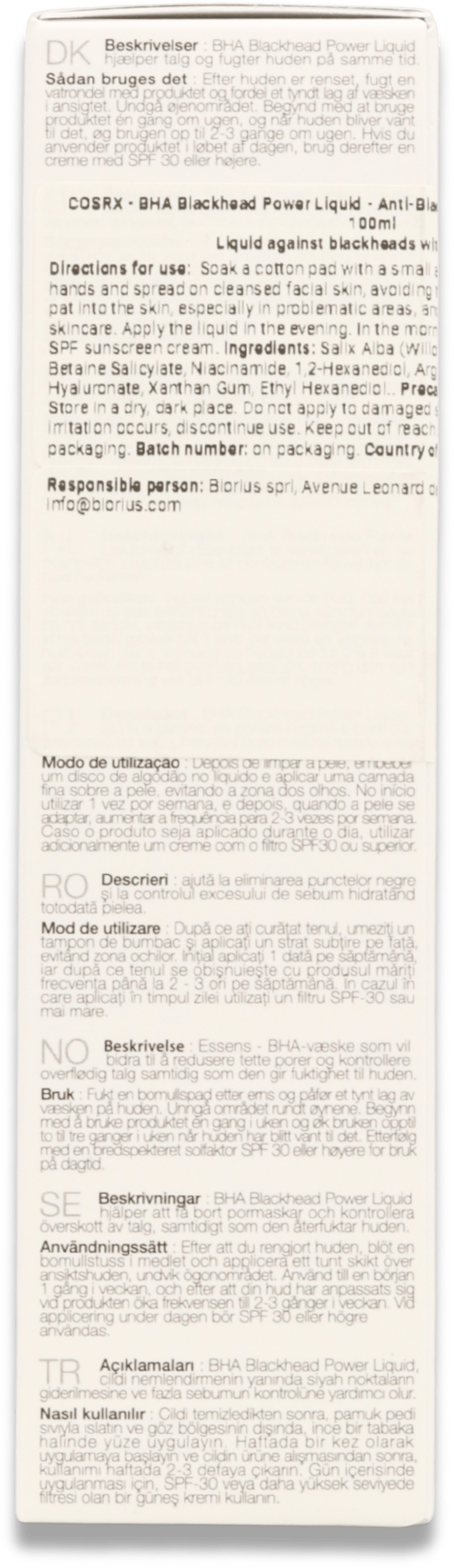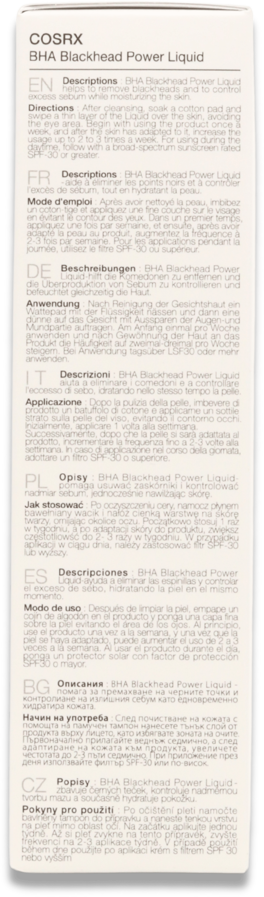 COSRX BHA Blackhead Power Liquid 100ml is a Korean exfoliating essence developed for those dealing with blackheads, congestion, and uneven texture. This lightweight formula contains 4% betaine salicylate, a natural BHA, which works to clear pores and manage excess oil without being harsh on the skin. Alongside willow bark water and niacinamide, it also supports brighter skin and a balanced barrier. Regular use tends to result in clearer, smoother skin, making it a popular choice for oily and blemish-prone skin types.