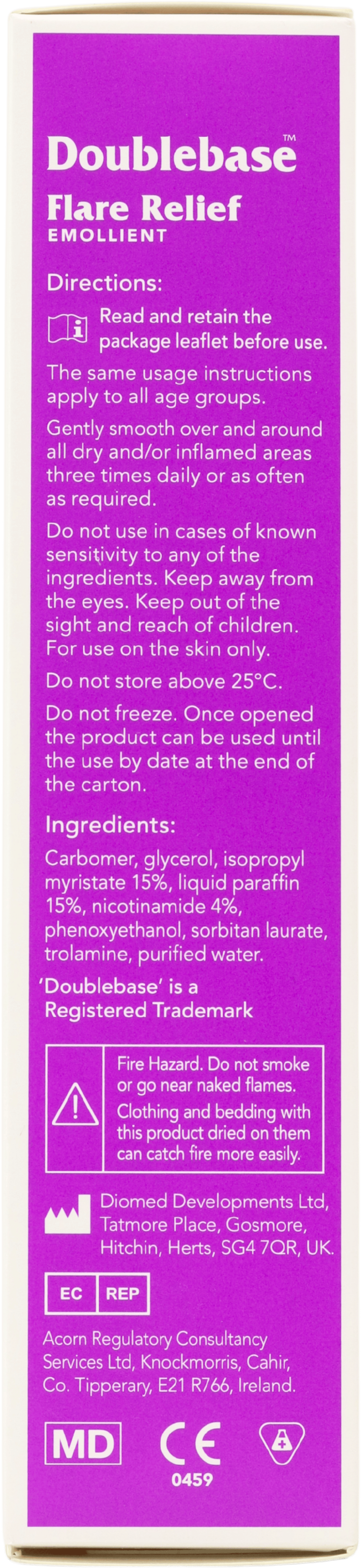 Follow the instructions in the patient information leaflet or your doctor/pharmacist's advice to use Doublebase Diomed Flare Relief Emollient for best results. Apply it 3 times a day or as needed, smoothly onto dry and/or inflamed areas, in the direction of hair growth, to avoid blocking hair follicles. Don't rub it in vigorously!