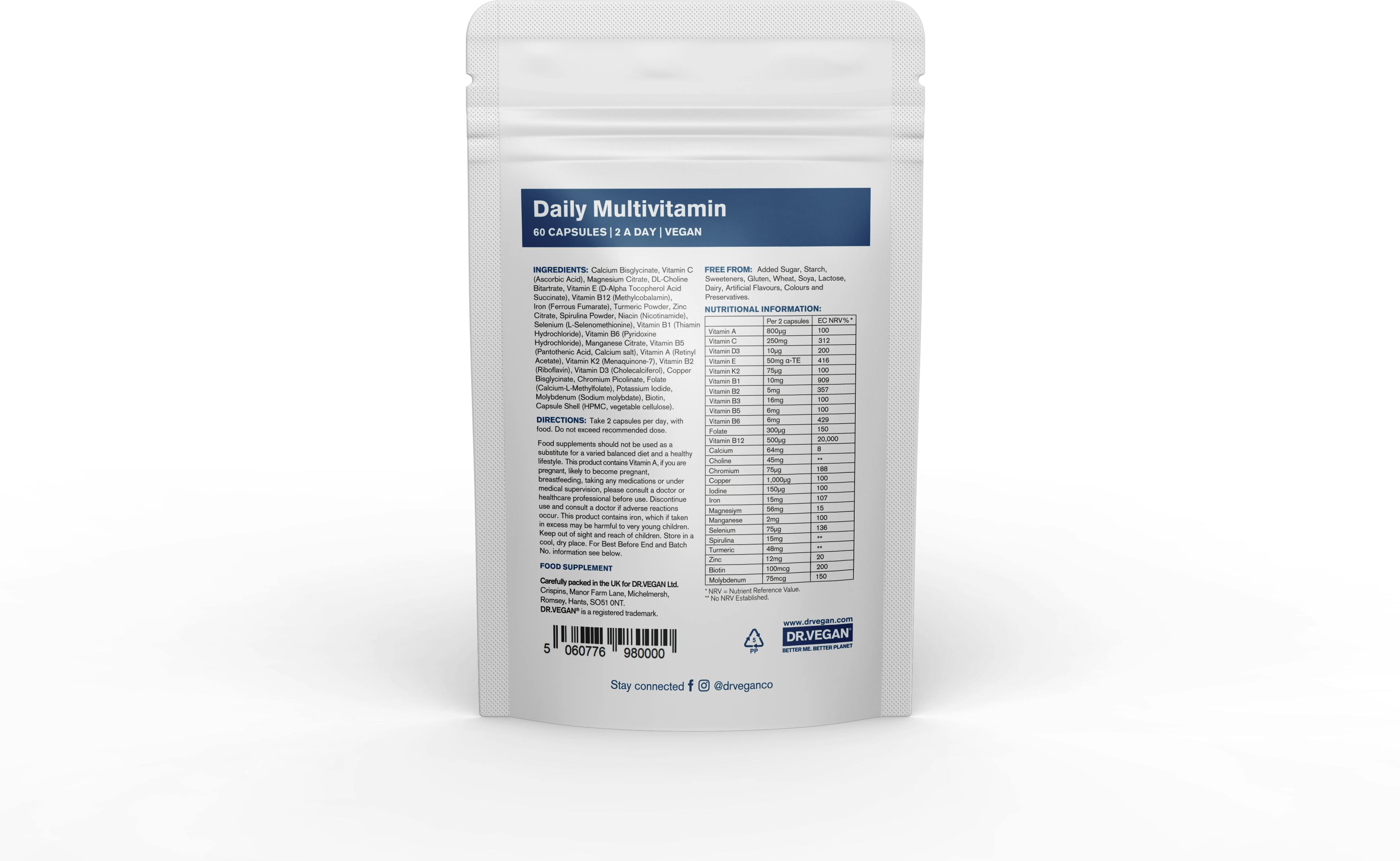 DR.VEGAN Daily Multi-Vitamin is crafted to bolster overall health and vitality, not specifically aimed at particular symptoms or ailments. It offers consistent support for vitality, immune system, complexion, tresses, nails, digestive health, cognitive function, and emotional state.