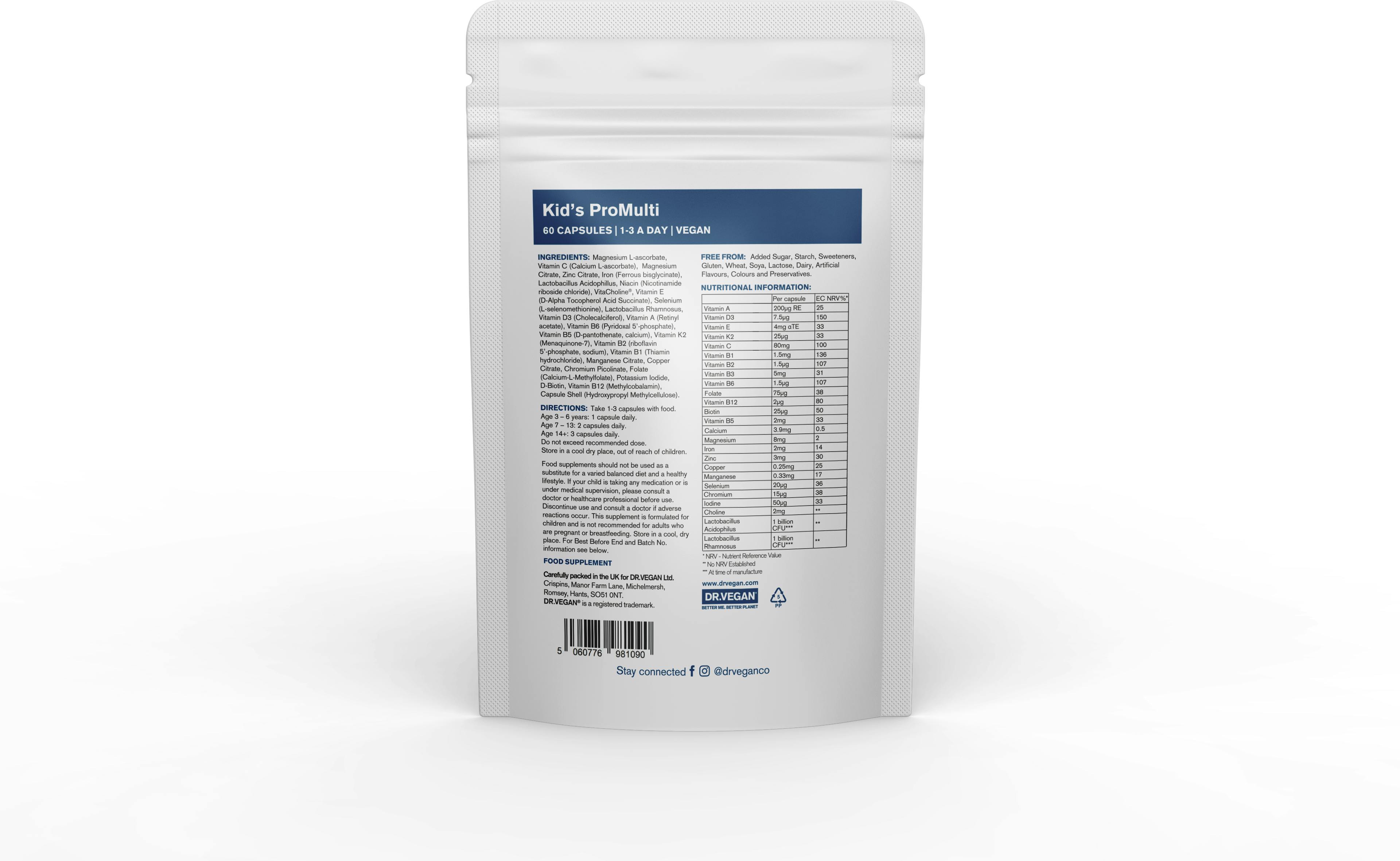 Kid's ProMulti is designed for children aged 3 to 16 years old. The formula adjusts to evolving nutritional requirements during varying growth phases. However, always consult a GP before introducing any supplement, especially if your child has underlying health conditions, allergies, or takes other medications. As a safety precaution, parents should store the product away from young children and pets.