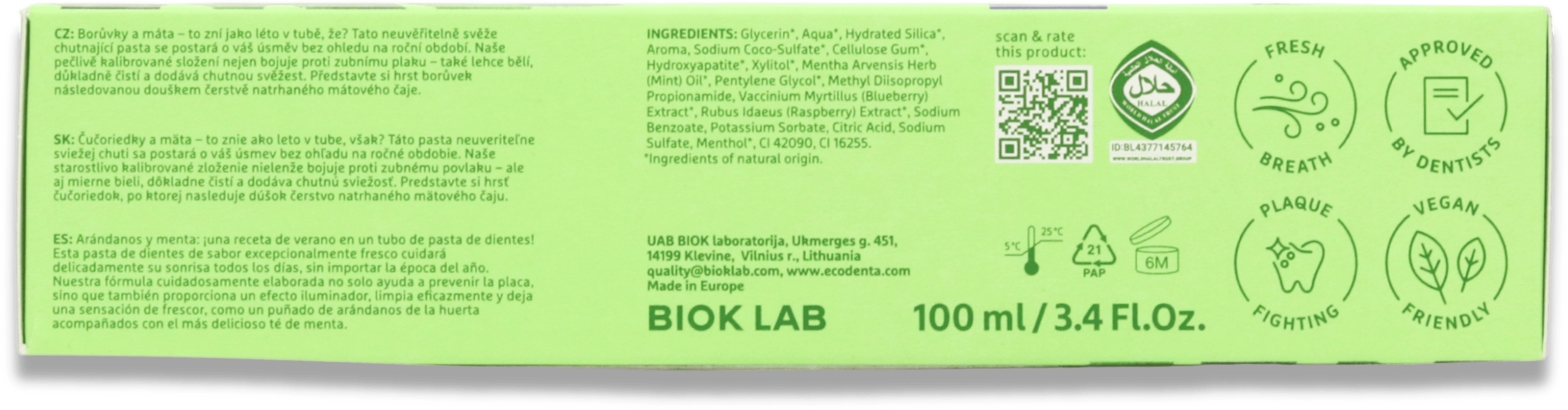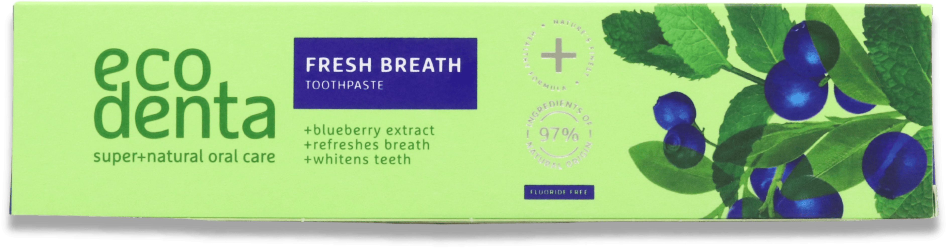 Ecodenta Fresh Breath Toothpaste 100ml is designed for individuals seeking a natural approach to oral care, promoting clean teeth and long-lasting fresh breath. Infused with natural blueberry extract, this toothpaste caters to adults and teens who prioritise effective yet gentle dental hygiene. Its innovative formula combats bacteria, maintains oral freshness, and contributes to daily oral health. Renowned for its distinct taste and plant-derived ingredients, this toothpaste is a popular choice among those looking for a refreshing oral care experience.