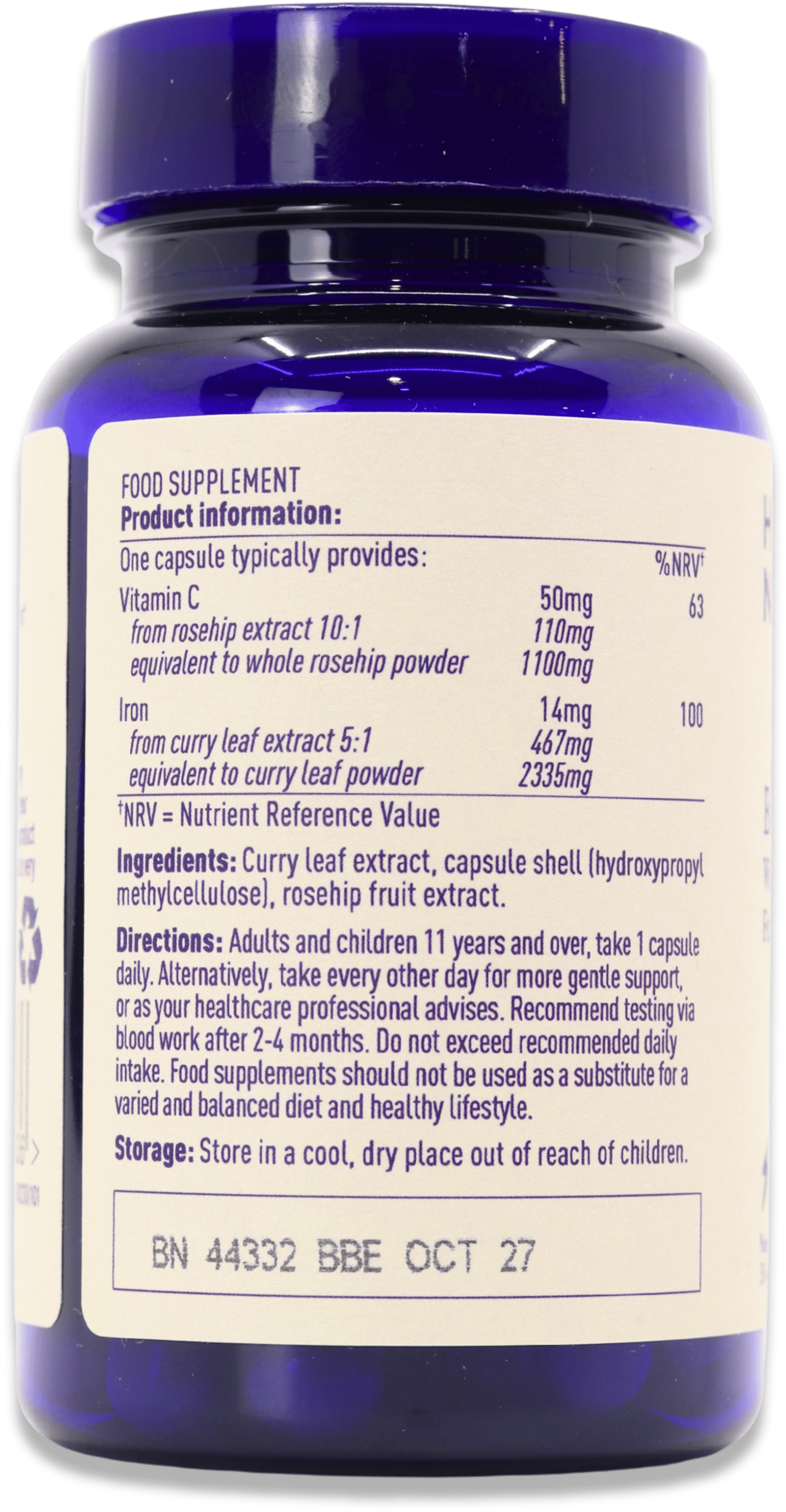 This supplement uses plant based iron sourced from curry leaves and vitamin C from rosehips. The capsule shell is suitable for vegetarian and vegan diets, making it appropriate for those following meat free lifestyles. Many people choose this type of iron to help support iron intake where diet alone may be insufficient.
