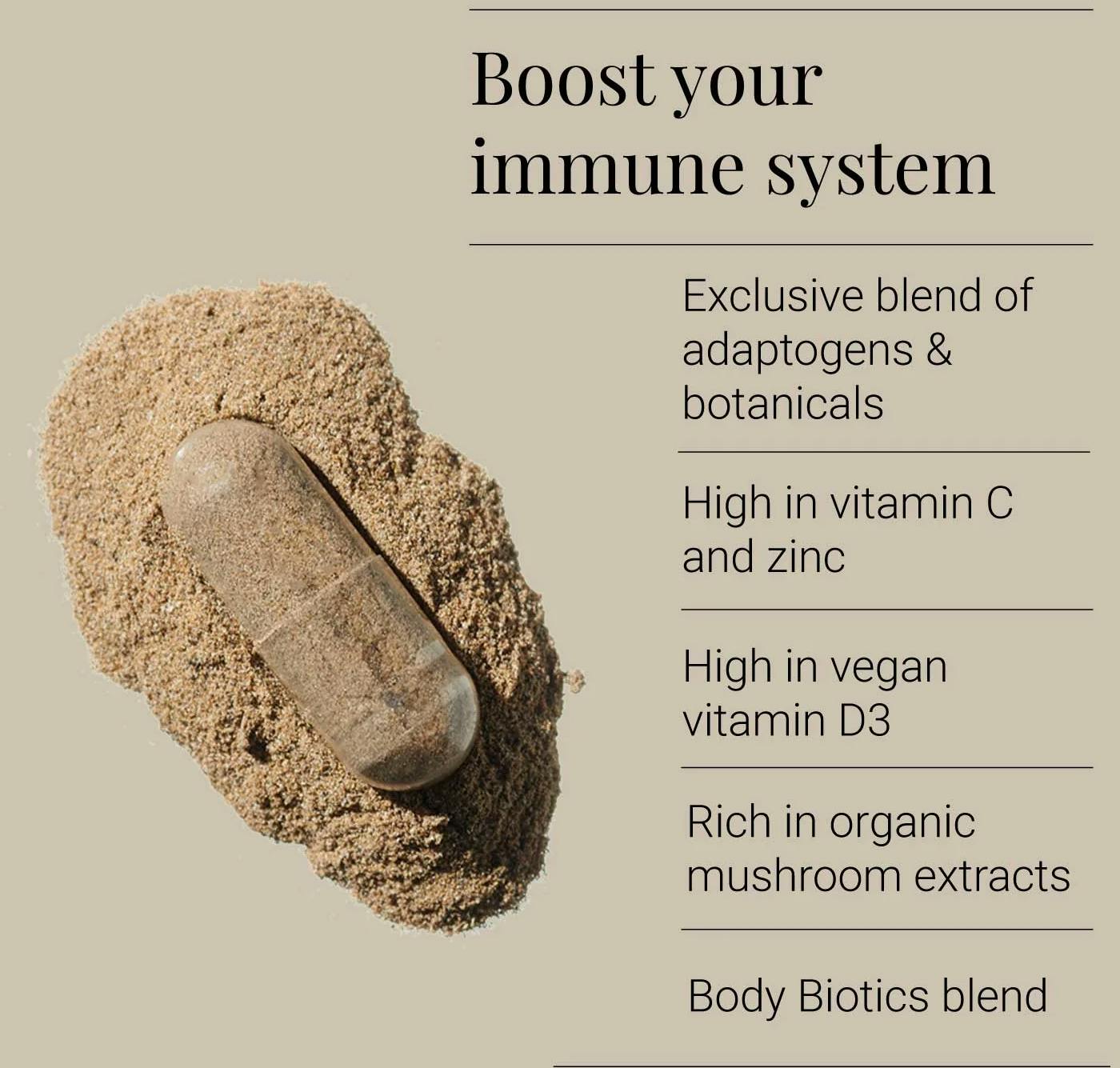 Reishi Mushroom Extract (Ganoderma lucidum) 125mg Hypromellose (Shell Capsule) 120mg Lynside® Forte Zinc (Saccharomyces cerevisiae) 100mg Shiitake Mushroom Extract (Lentinula edodes) 100mg Astragalus Root Extract (5:1)(Astragalus membranaceus) 50mg Body Biotic Blend 50mg Acerola Extract (Malphigia glabra) 50mg Olive Leaf Extract (Olea europaea) 12.5mg Garlic Extract (50:1) (Allium sativum) 8mg Elderberry Extract (64:1) (Sambucus nigra) 7.8mg Vitamin D3 (Vegan) 4mg