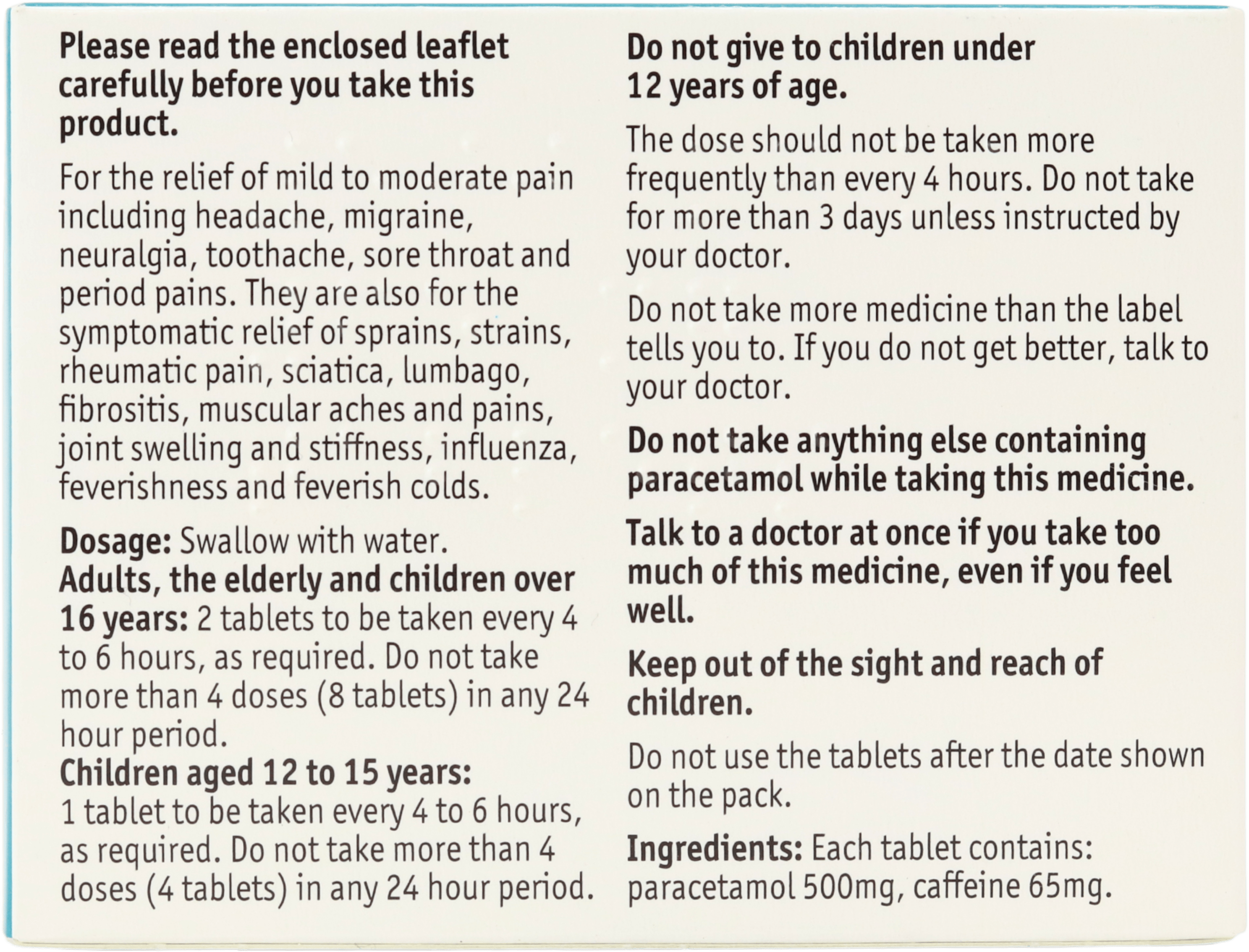 Active ingredients: Paracetamol 500mg, Caffeine 65mg4.
