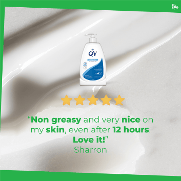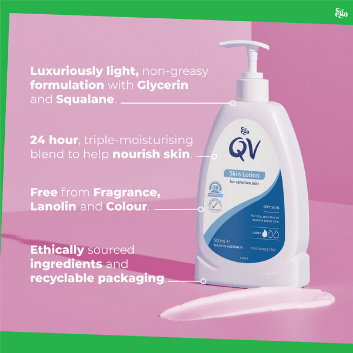 QV Skin Lotion for Dry Skin Conditions is a lightweight, non-greasy moisturising lotion designed to provide intense hydration for all skin types, including sensitive and dry skin. Treat and relieve symptoms of dry skin conditions, such as psoriasis, eczema, dermatitis, xerosis or ichthyosis – and with 24-hour moisturisation, you'll feel soft and smooth all day.
