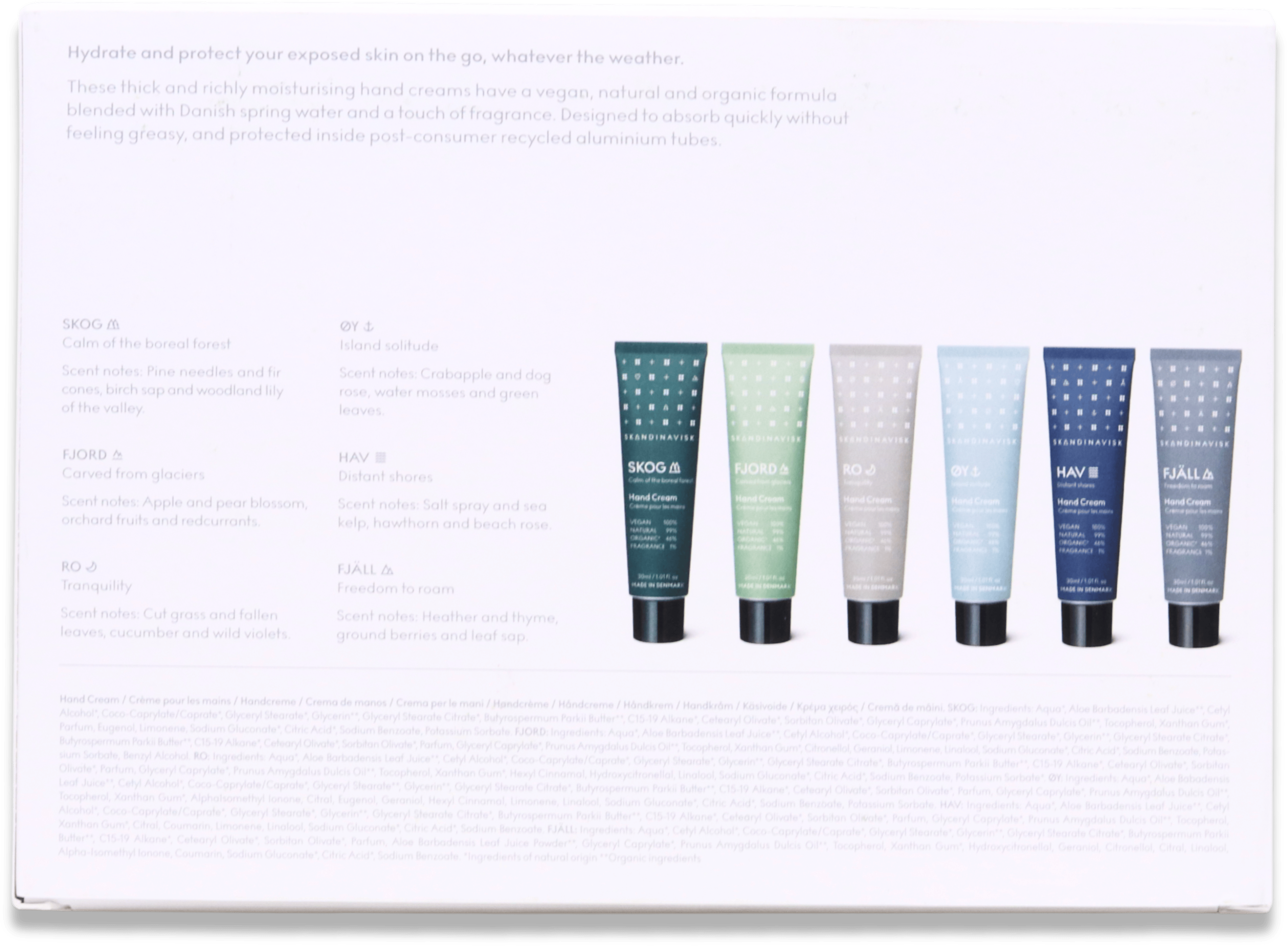 Skandinavisk Over Land & Sea A Hand Care Collection Gift Set presents a harmonious fusion of six hand creams, drawing inspiration from the beauty of Scandinavian landscapes. Crafted for those in pursuit of velvety, well-moisturised hands tinged with a hint of Nordic fragrance, this collection caters to parched skin, frequent hand cleansers, or anyone in search of a mild, plant-based present. With organic components in every formula, you're assured of proven skin hydration and gentle nourishment.