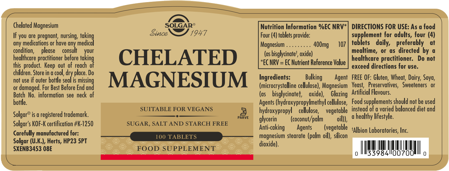 Solgar Chelated Magnesium is a highly regarded supplement offering 100mg of easily absorbable magnesium per tablet. It's acclaimed for its effectiveness in supporting nerve and muscle function, enhancing bone and heart health, and aiding in energy metabolism. This formulation is especially beneficial for those seeking to reduce fatigue and maintain mental equilibrium. Suitable for vegans, vegetarians, and those following kosher diets, Solgar Chelated Magnesium aligns with various dietary needs.