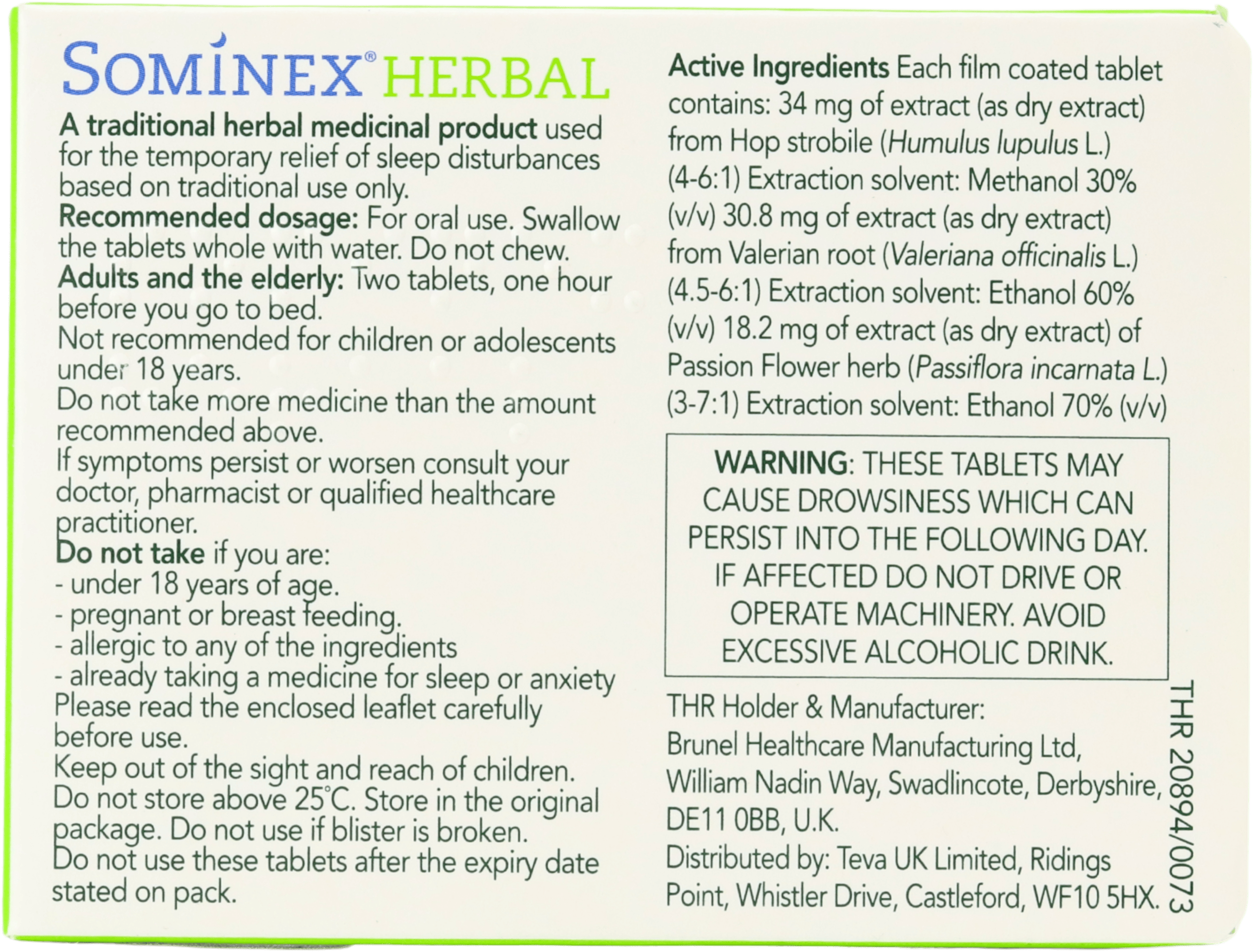 Sominex Herbal Tablets offer a natural approach to enhancing sleep quality, especially suitable for those encountering temporary sleep disruptions due to stress, lifestyle changes, or jet lag. The formula integrates a calming blend of traditional herbal components like valerian, hops, and passionflower, renowned for their soothing properties. Sominex Herbal stands out as a purely natural solution, aiming to alleviate sleep disturbances and facilitate a smooth transition into a restful night's sleep.