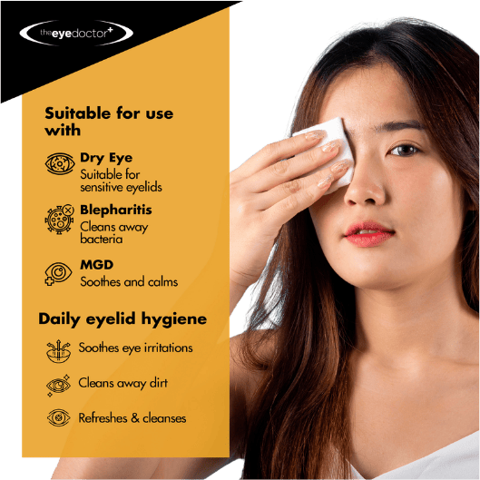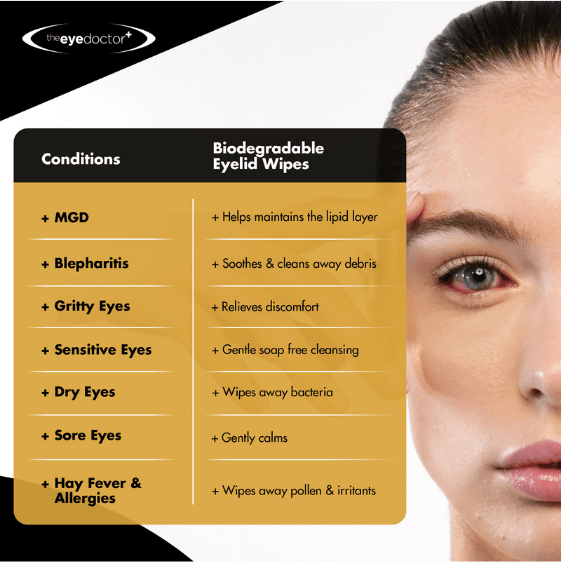 The Eye Doctor Biodegradable Lid Wipes are suitable for managing symptoms caused by dry eye, MGD, and blepharitis.
