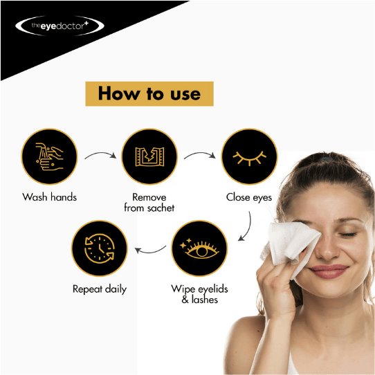 Wash your hands before use. Remove the wipe from the sachet. Close your eye, and wipe from the nasal corner of your eye outwards across the lashes.