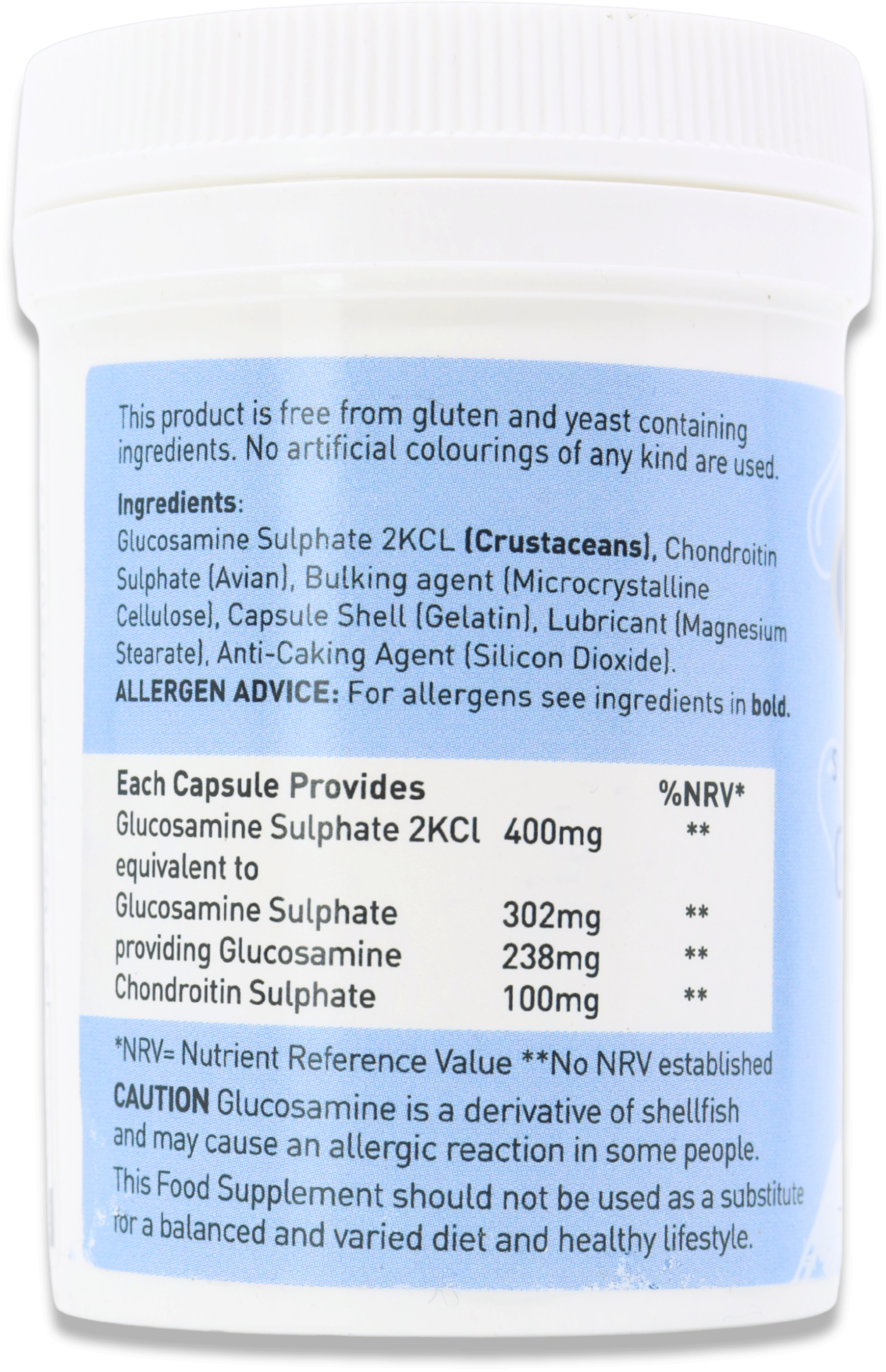 Glucosamine Sulphate 2KCI 400mg – equivalent to Glucosamine Sulphate 302mg, Providing Glucosamine 238mg, Chondroitin Sulphate 100mg.