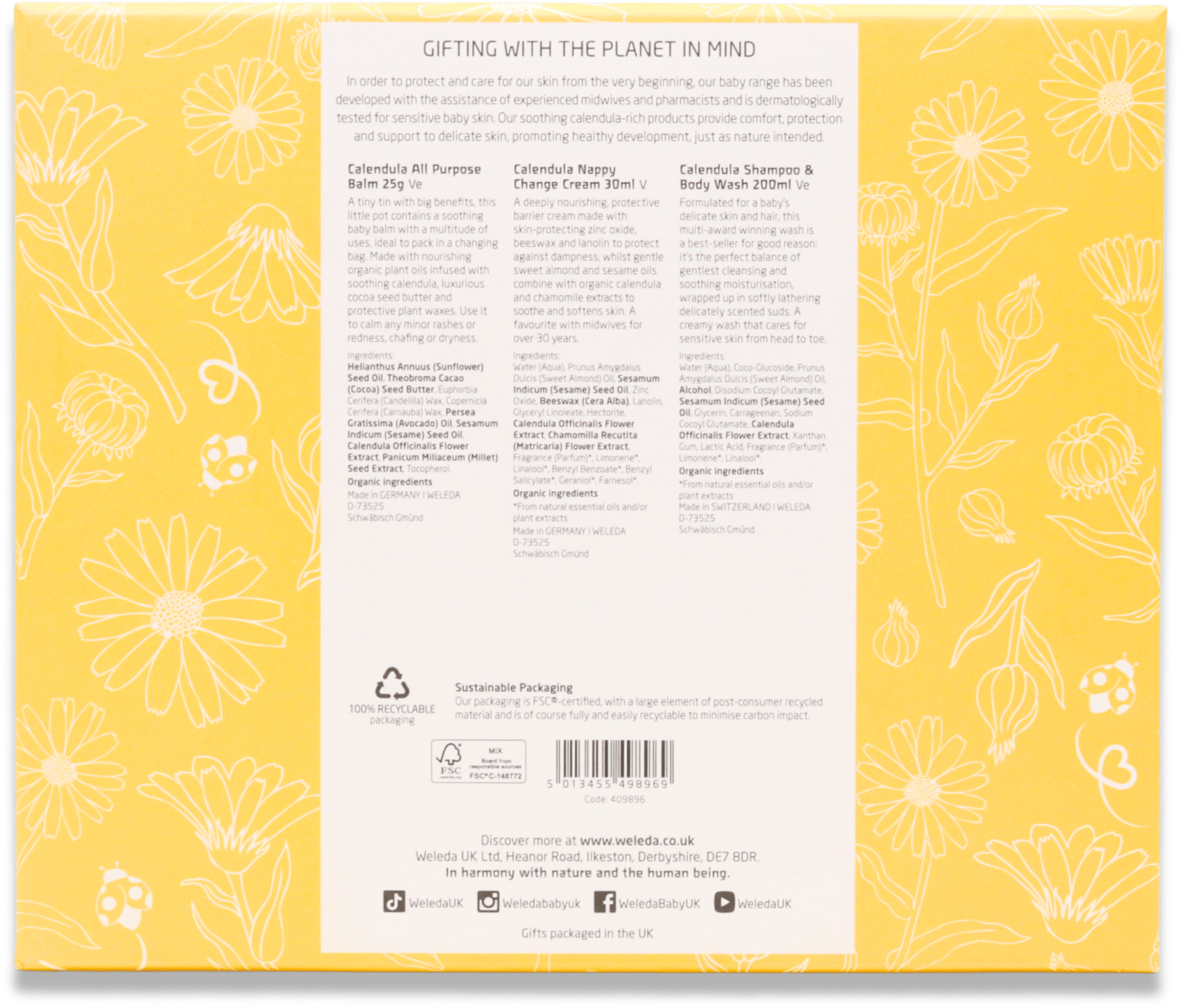 The set contains a Calendula Shampoo & Body Wash, a Nappy Change Cream, and an All Purpose Balm. Each product is designed for gentle, daily care of your baby’s skin.